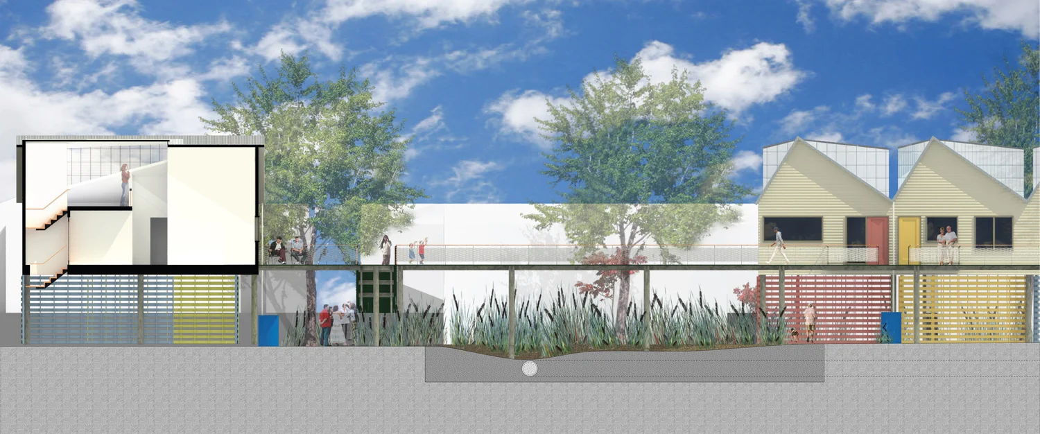 Designed for an existing bungalow community in Sheepshead Bay, Brooklyn, these pre-fabricated homes address the vulnerabilities of both the individual house and the neighborhood to climate change. In the comprehensive master plan (see PLANNING: SHEEPSHEAD BAY), the new-elevated houses are accessed by a communal boardwalk above a landscape of water gardens. The small houses have dormers that provide a mezzanine living space and passive cooling and cross ventilation. In this scheme, the original detached bungalows are replaced with row houses in order to capture former side yards as new gardens for water management. Each home consists of two, 10' wide by 35’ long prefabricated modules and a dormer.